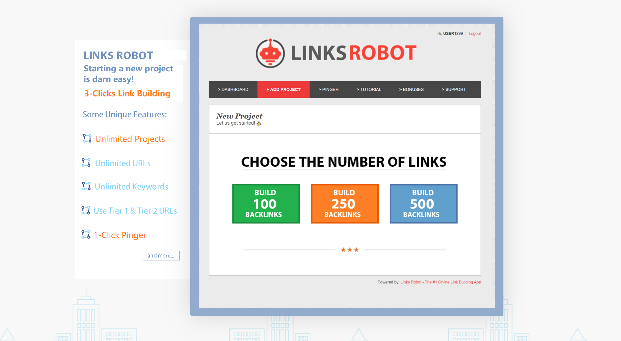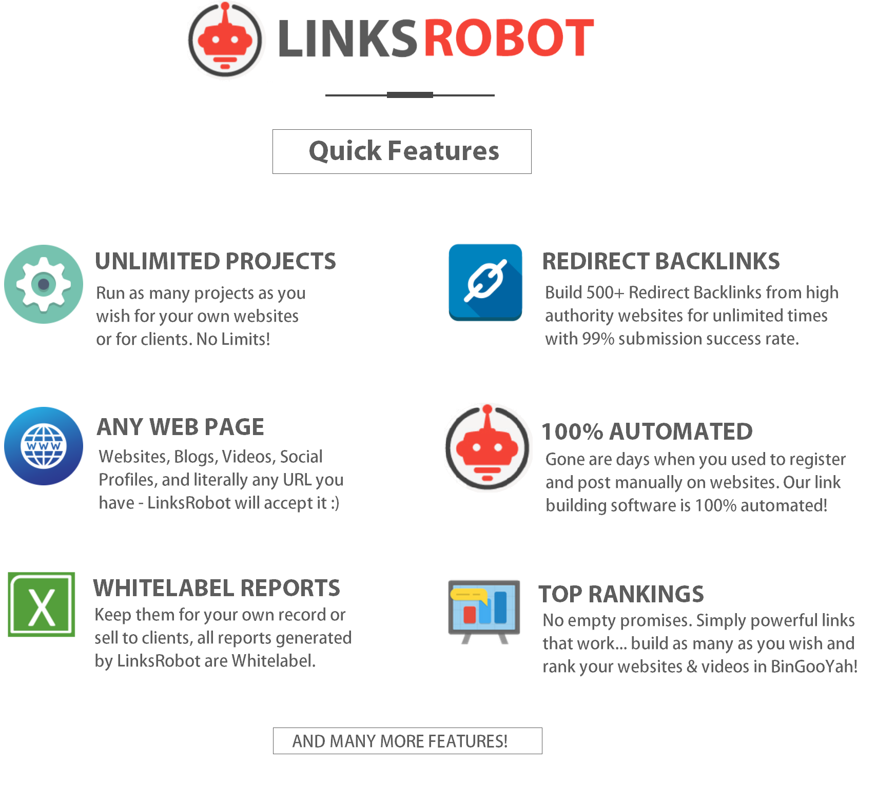 LinksRobot creates 500+ redirect backlinks within 3 clicks for Unlimited number of websites, videos, and URLs.